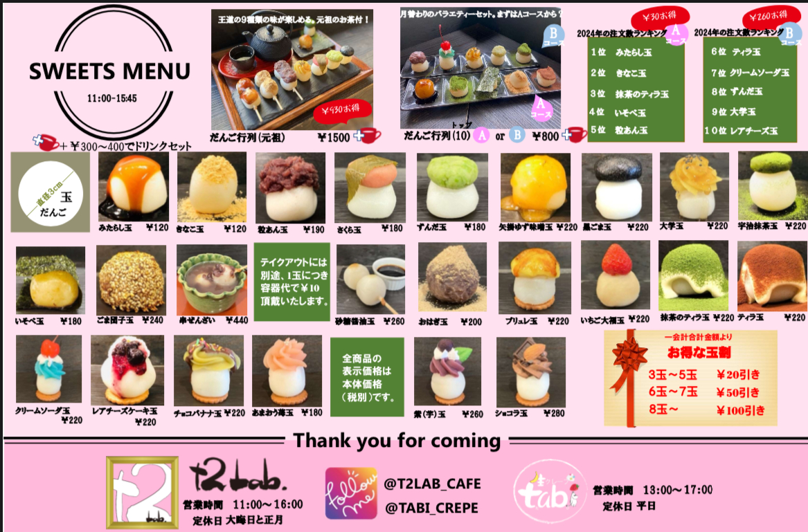 Welcome to t2lab., a delightful café nestled in Okayama, Japan, where culinary creativity meets comfort. The menu is a vibrant celebration of traditional and contemporary flavors, with a particular emphasis on their exceptional お団子 (dango). Customers rave about the variety, noting that each warm, soft skewer offers a new taste adventure, from unique toppings to nostalgic flavors.